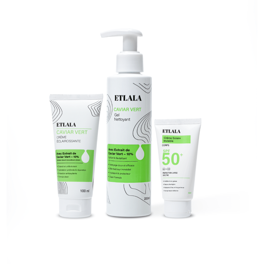 Découvrez le pack skincare complet ETLALA, une routine luxueuse en 3 étapes, formulée à base de caviar vert, un super-ingrédient marin riche en antioxydants, minéraux et acides aminés. Ce trio de soins a été conçu pour nettoyer, traiter et protéger votre peau tout en révélant son éclat naturel, jour après jour.
